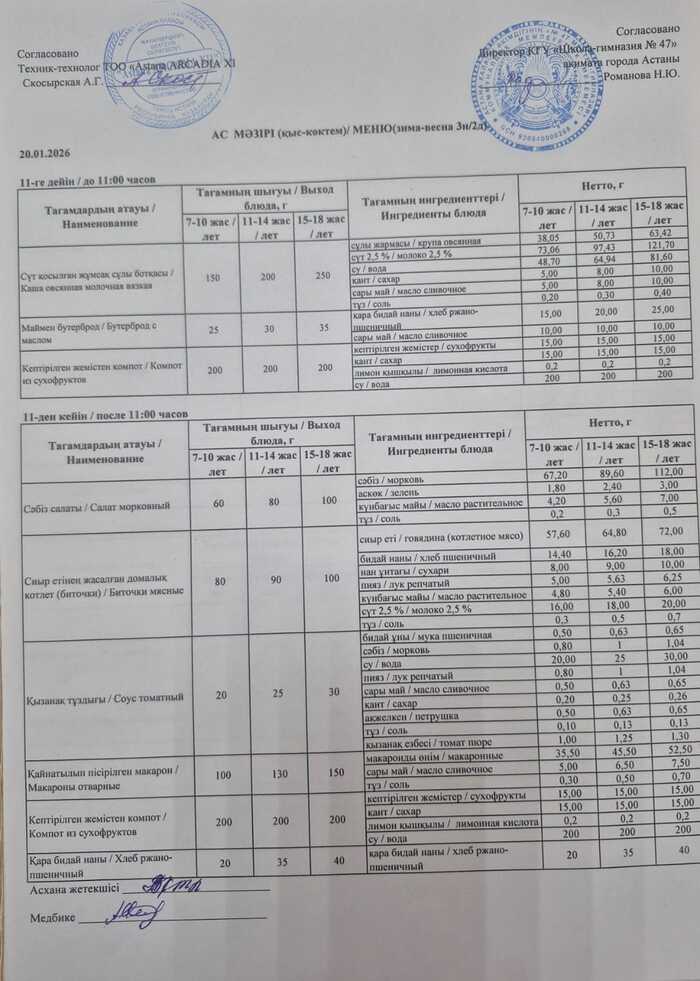 Меню на 20 января 2026г