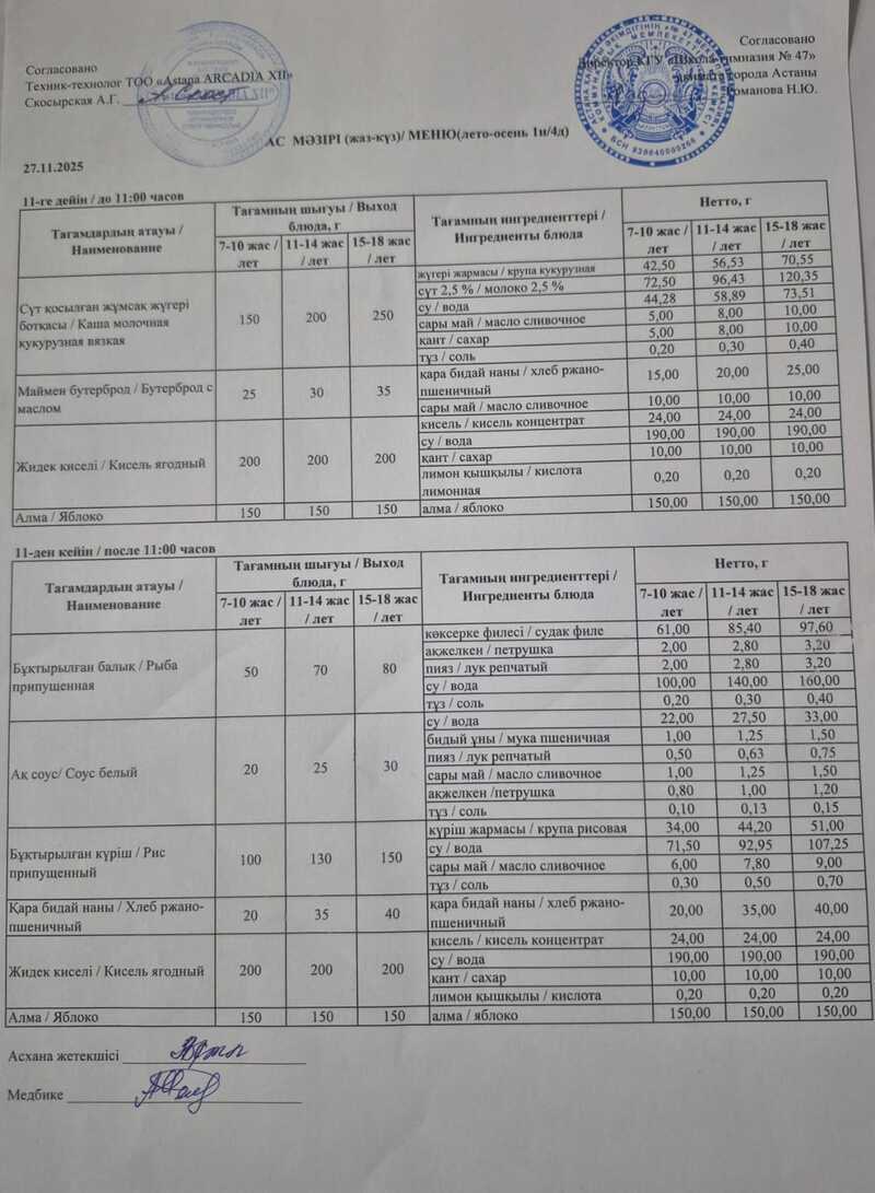 меню на 27 ноября 2025г